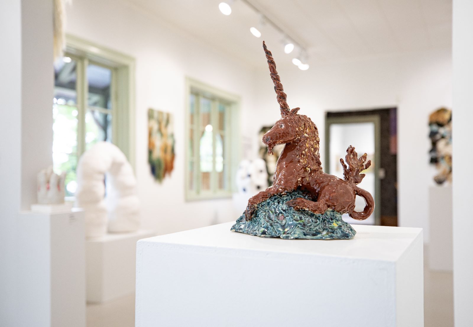 The Finnish artist Markus Jäntti and the French-German artist Oscar Veyrunes open their first duo exhibition Automatic at Paja Galleria in Helsinki with a new body of works including paintings, monotypes and sculptures. This project reflects the artist's ongoing exploration of the shifting moment when products become cultural myths and symbols. In his paintings and prints, Jäntti investigates the figures of horses, unicorns, roses and cars. Veyrunes, on his part, develops a specific weaving methodology of wire meshes around domestic objects. This dialog creates a hybrid environment where the familiar – toy car, pillow, flowers, cartoonish figure – is counterbalanced by peculiar and unforeseen moments. At times, the works seem like memories, already somewhat vague and elusive, punctuated unexpectedly by details wafting in from other contexts.